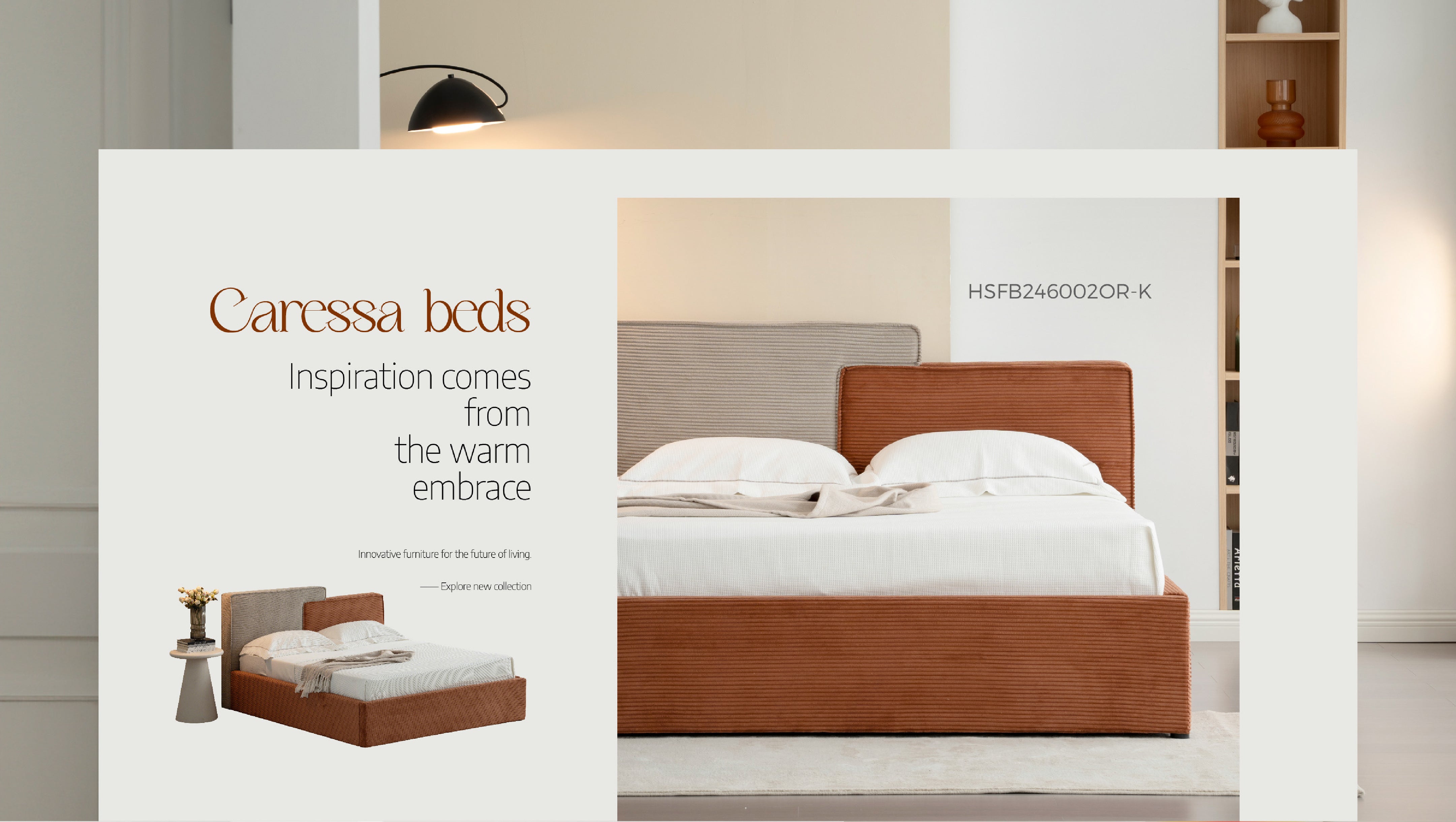 Designed for both beauty and comfort, Caressa S pairs tactile richness with understated form. Its plush texture, sculpted edges, and soothing palette make it more than a bed, it’s a centerpiece of comfort, warmth, and quiet confidence.