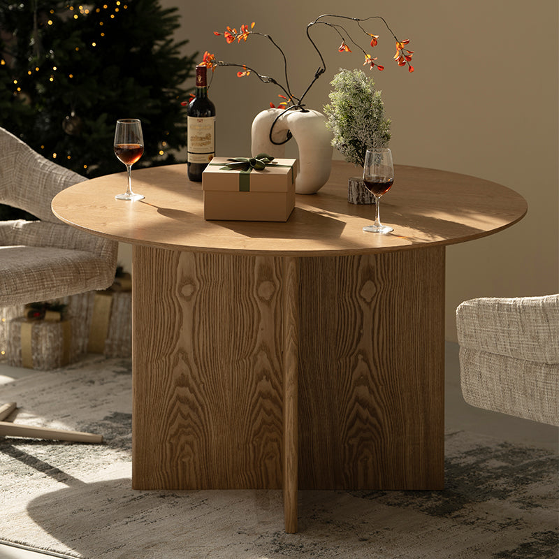 The surface of the Eden round dining table imitates the natural grain of wood, and looks very sophisticated and stylish. The legs are designed with a cross design, which is visually attractive and chic. The overall design adds style and elegance to the dining area.