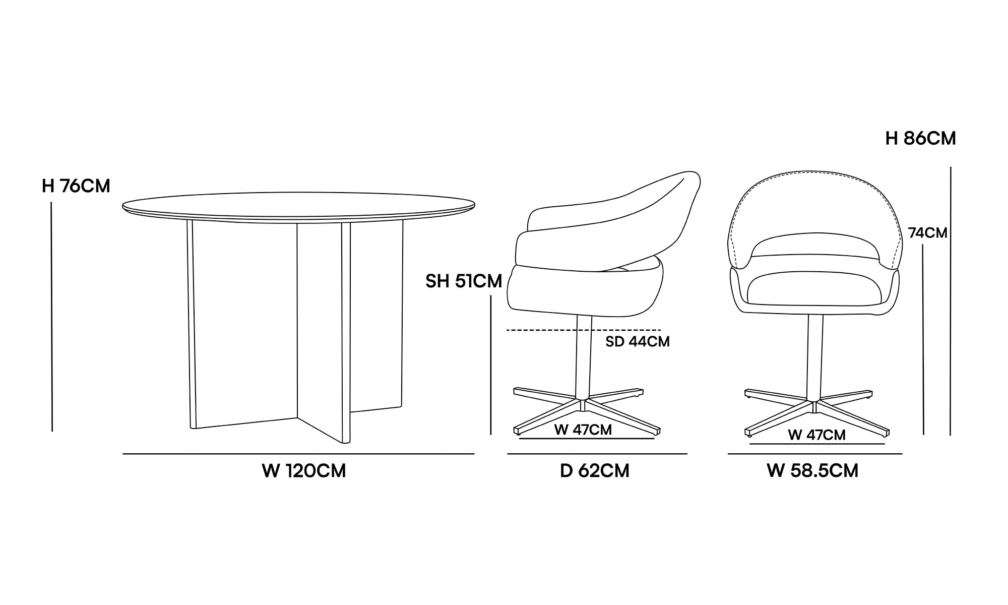 The best combination of elegance and comfort has to be the Eden round dining table (Ø120 cm) and 4 Briar linen swivel dining chairs.