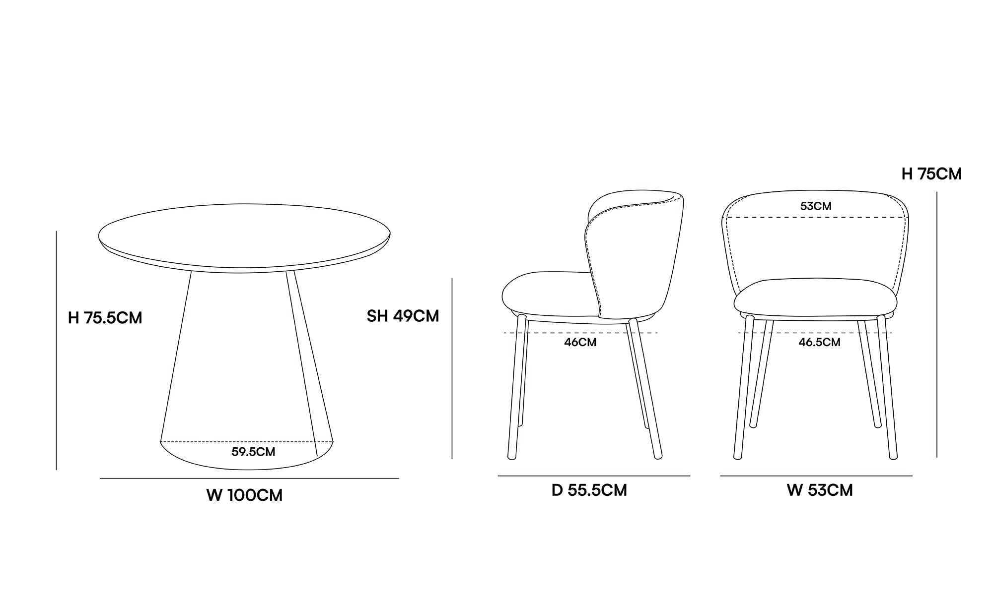 Elegant Dining Set: Elowen Round Table & Karin Chairs. Create a modern and inviting dining space with the Elowen Round Dining Table and Karin Dining Chairs. The Elowen Table (100 cm in diameter) perfect for intimate meals or small gatherings. Its round design promotes conversation while saving space, making it ideal for cozy apartments or stylish kitchens.