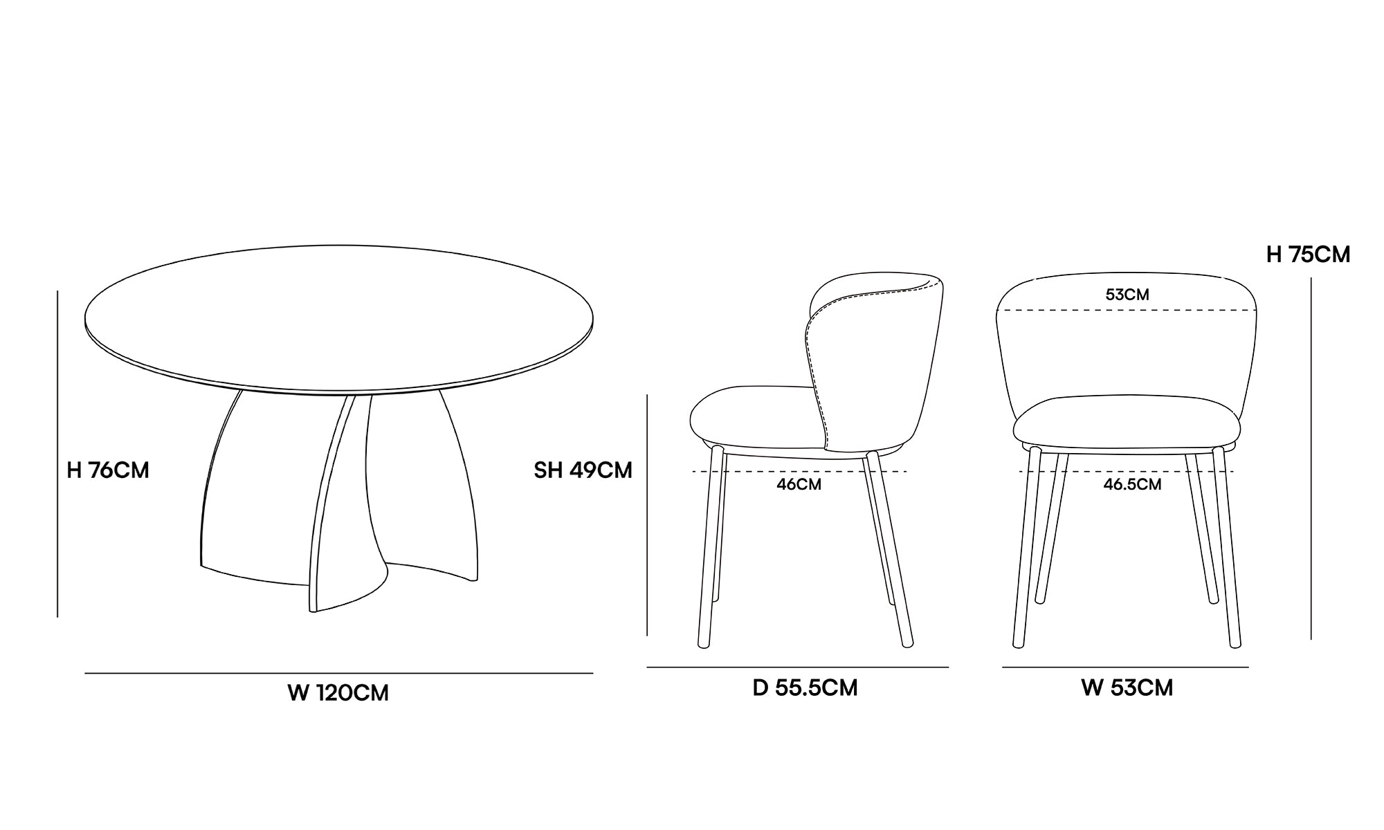 Create a dining space that balances contemporary elegance with everyday functionality using the Gemma 120cm Round Dining Table and Karin Dining Chairs.